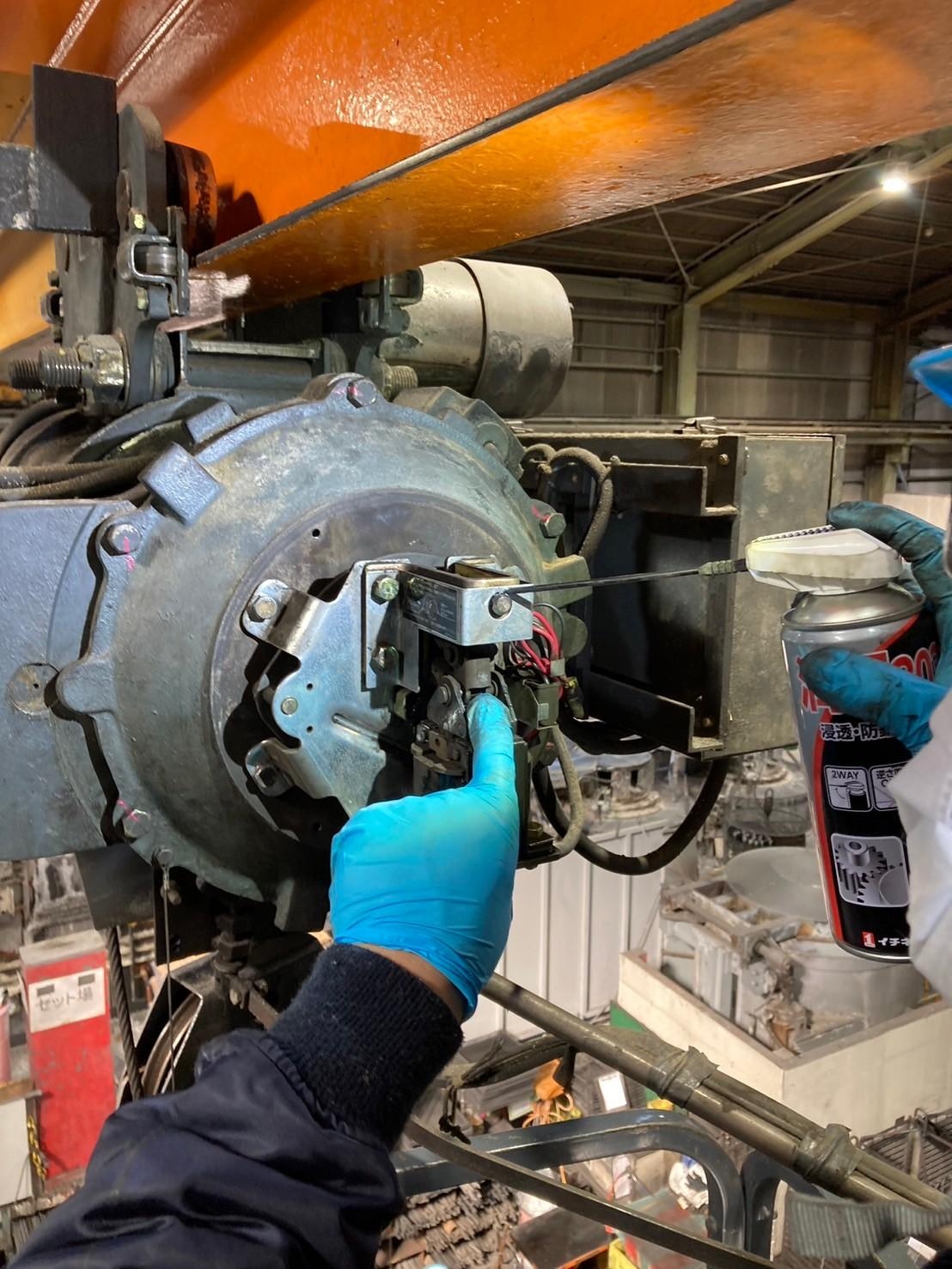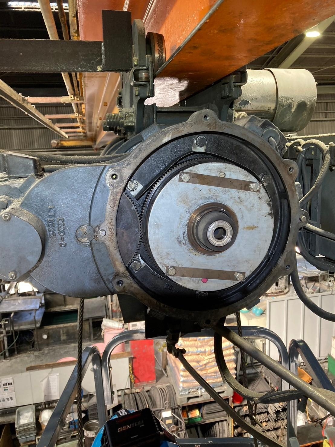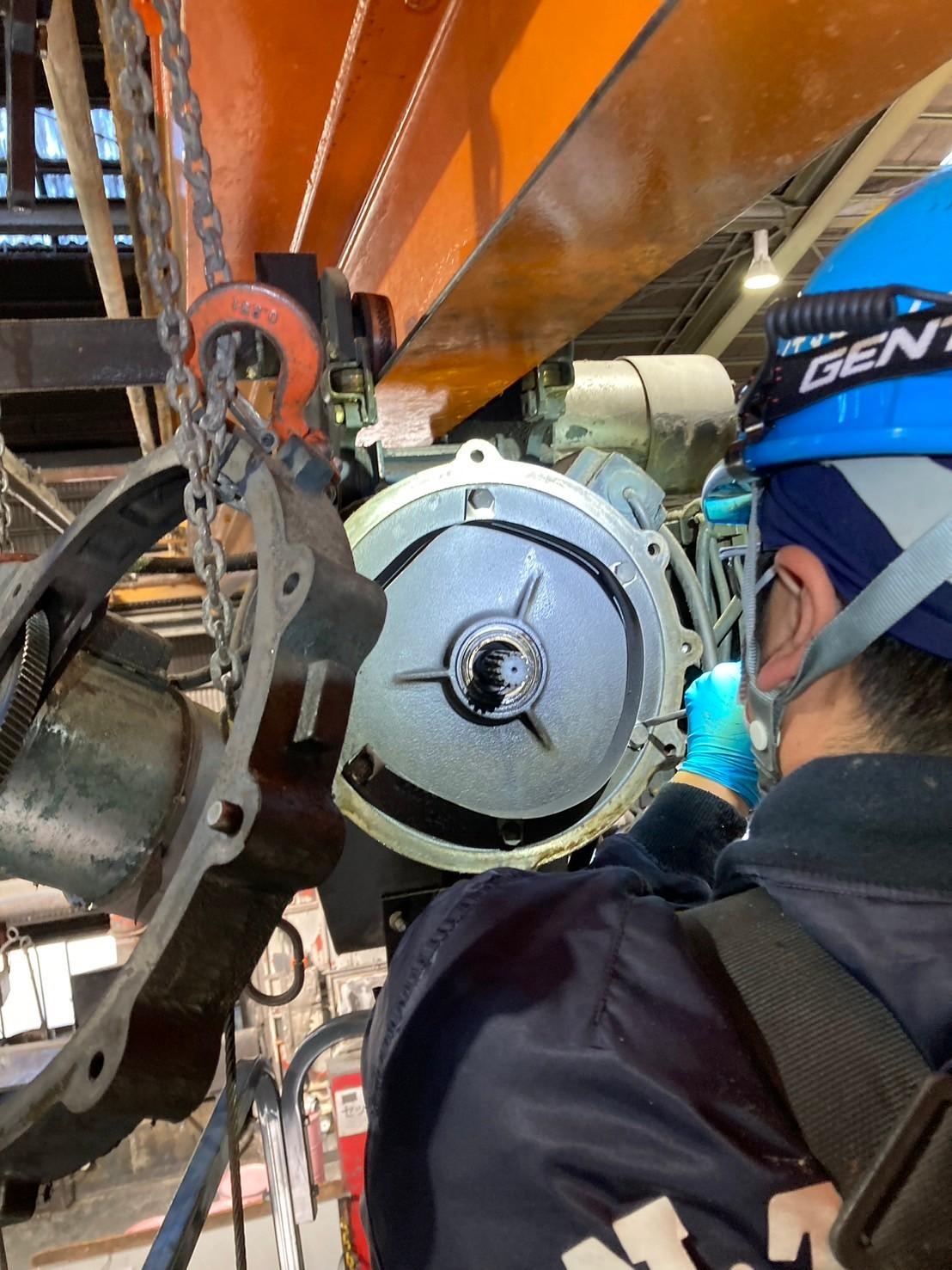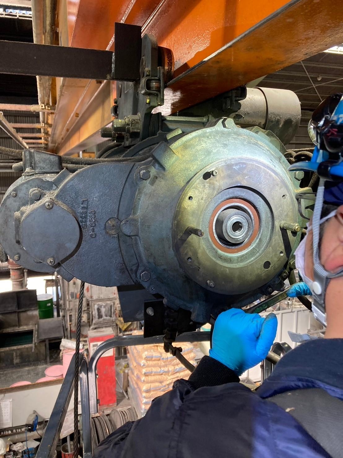 クレーンの巻上げブレーキ部分のベアリングが劣化していたため、巻上下が正常に作動せずトラブルが発生しておりました。