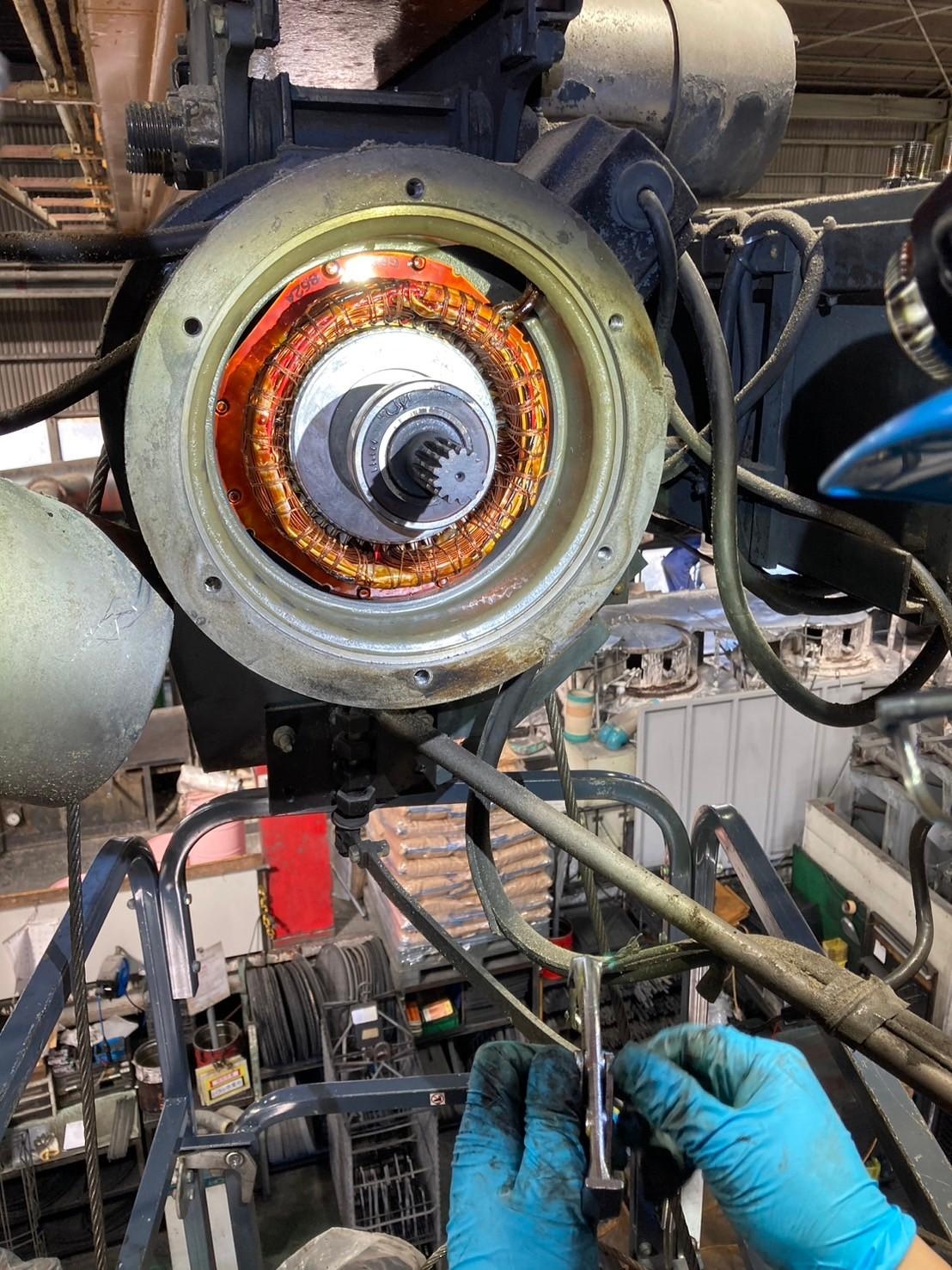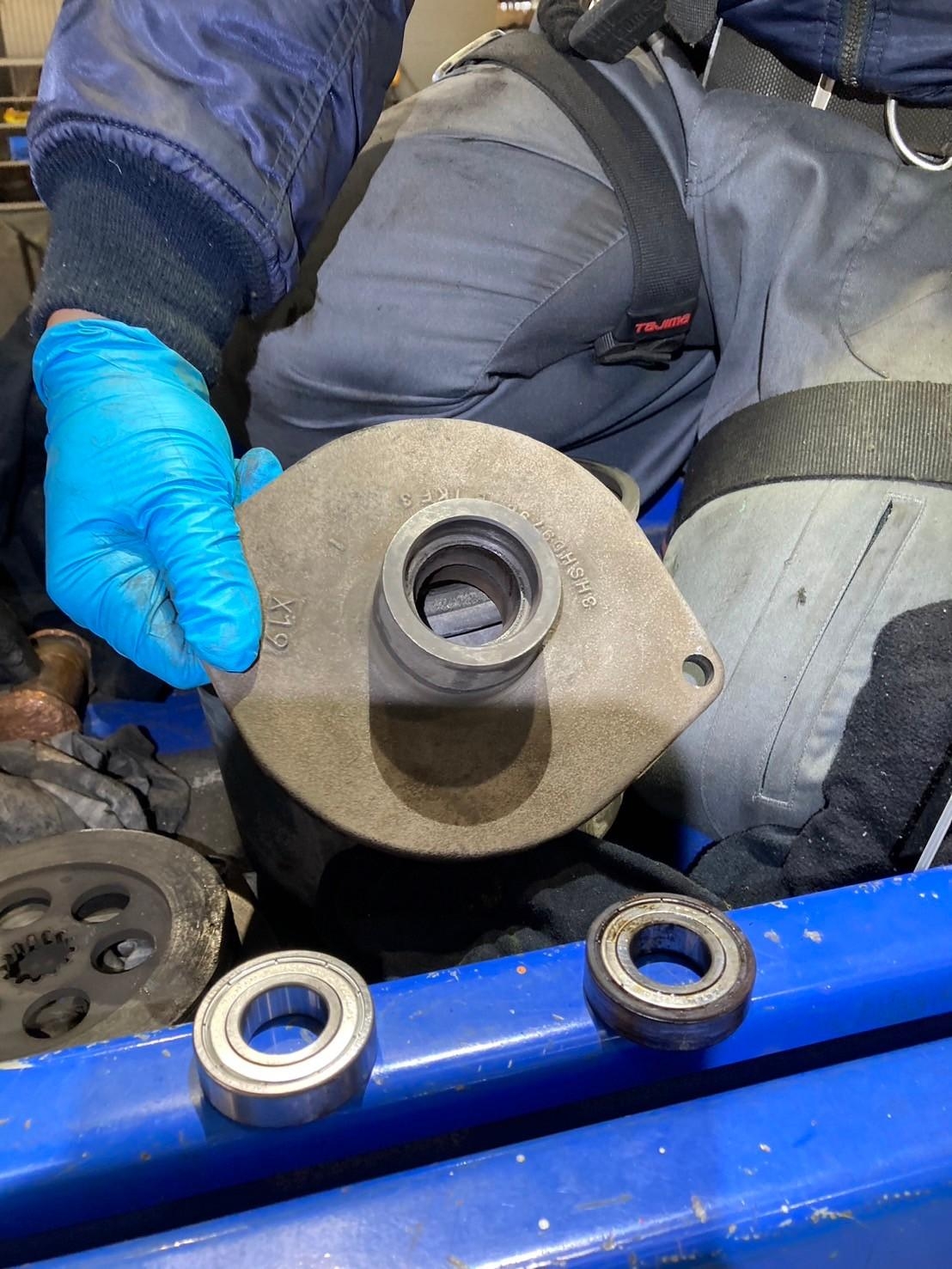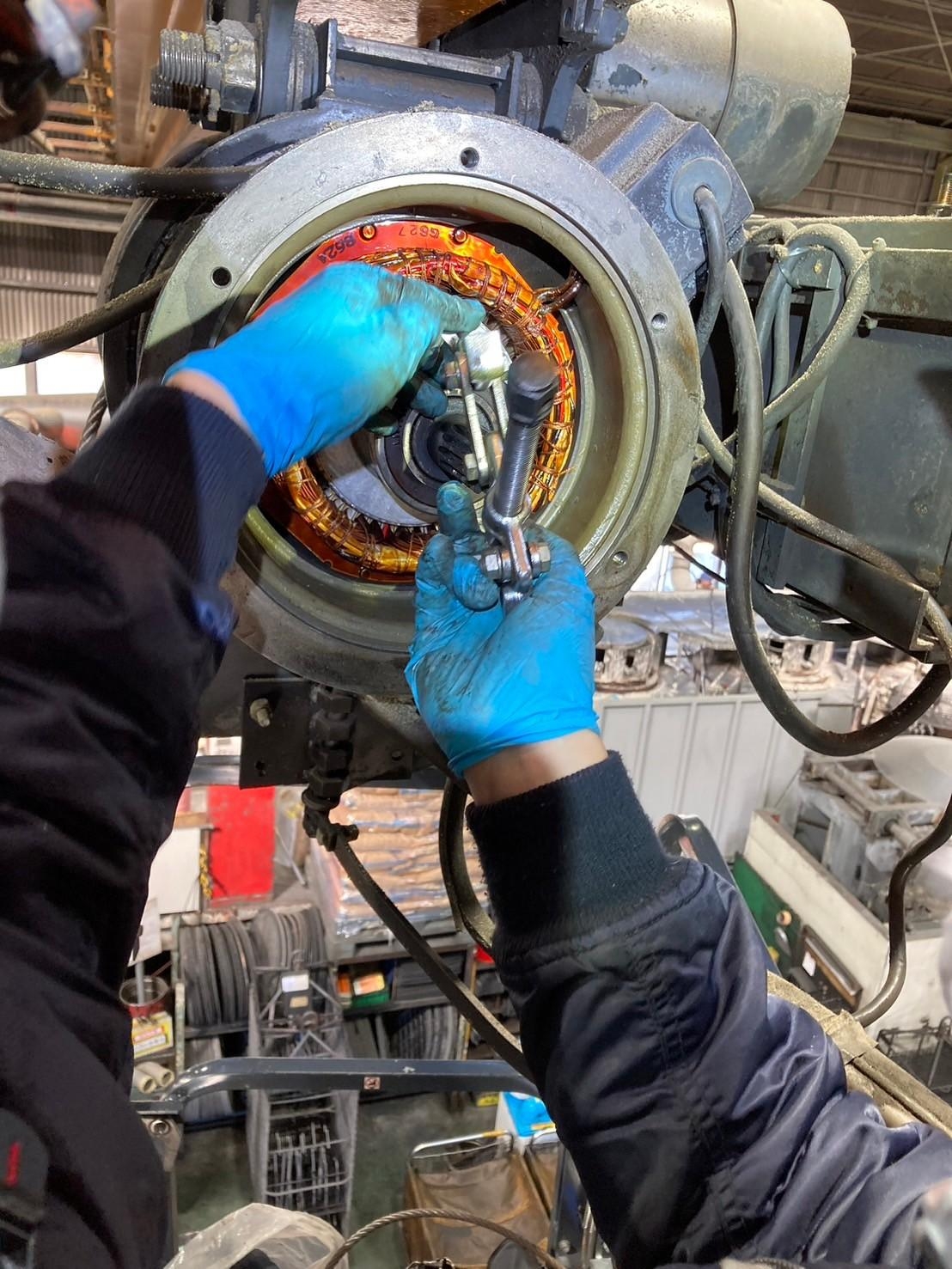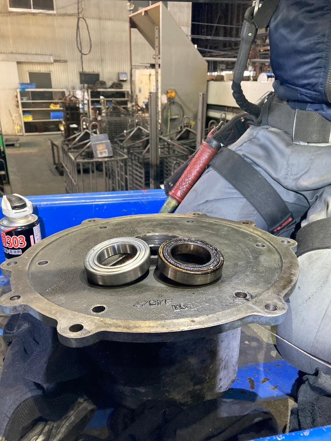 クレーンの巻上げブレーキ部分のベアリングが劣化していたため、巻上下が正常に作動せずトラブルが発生しておりました。