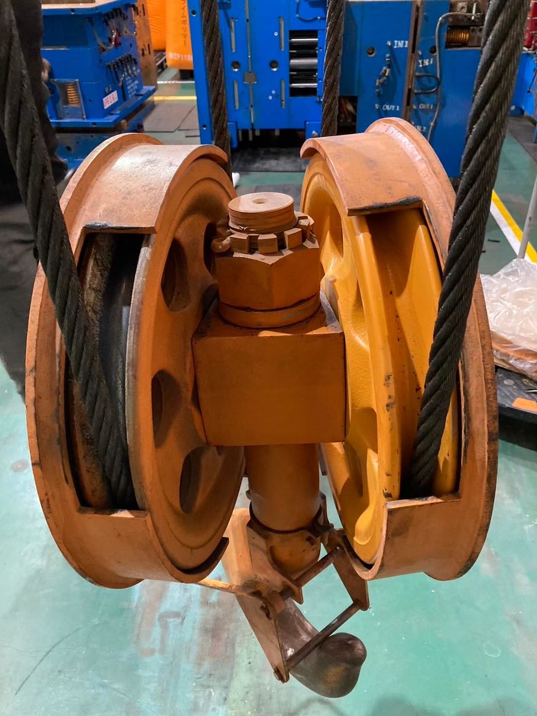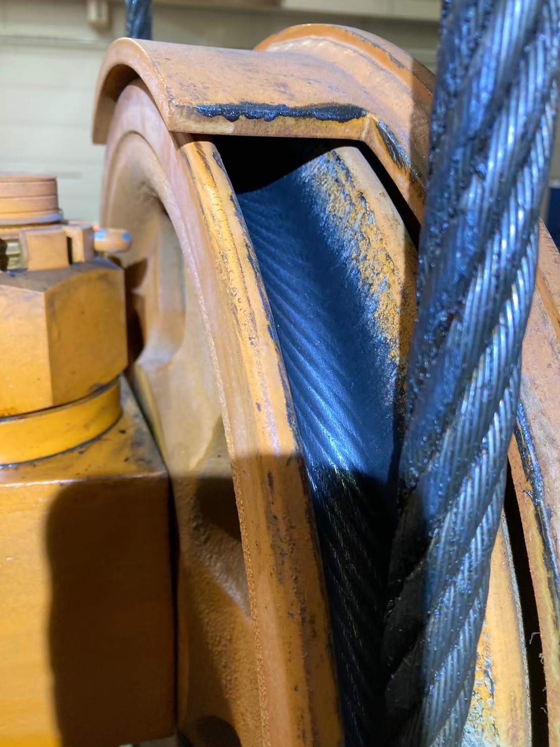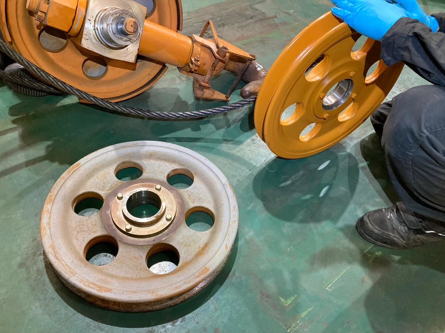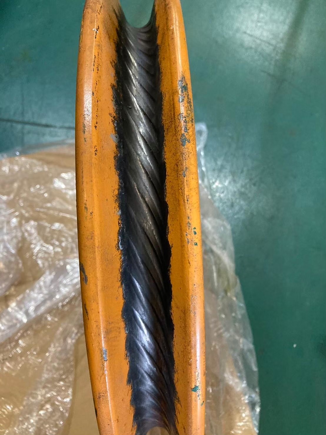 当社では、定期点検の際にクレーンのロードブロックシーブに「条痕(ワイヤーロープによる摩耗痕)」を確認しました。そのため、安全性を確保するためにシーブを新品に交換いたしました。クレーンのシーブ(滑車)は、常にワイヤーロープとの摩擦が発生するため、長期間の使用で摩耗や条痕が進行します。摩耗したまま使用を続けると、ワイヤーロープが傷みやすくなり、切断や寿命の短縮につながる恐れがあります。シーブやワイヤーロープの摩耗は、クレーンの安全稼働に直結する重要な点検項目です。定期的な点検と部品交換を行うことで、故障や事故を未然に防ぐことができます。